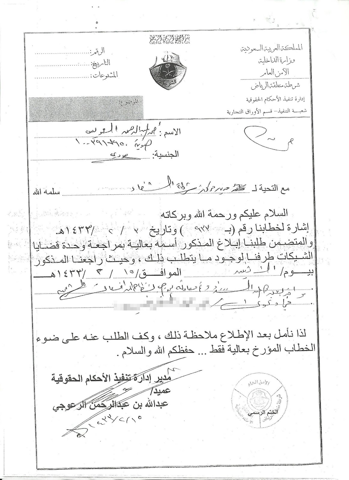ساعدوني .. أبحث عن بناتي ! بسم الله الرحمن الرحيم اقسم بالله العظيم الذي شق سمعي وبصري واجرى الدماء في عروقي بأني لم اقوم بنشر هذه الوثائق الا لتكالب الفاسدين ومؤامرتهم ضدي منذ تاريخ 1421/10/14هـ حيث تقدمت لصاحب السمو الملكي / الأمير محمد بن نايف مساعد وزير الداخلية للشؤون الأمنية بعريضة دعوى وذكرت فيها من الفساد ما الله به عليم من مسؤولين بالإدارة العامة للخدمات الطبية في وزارة الداخلية وكذلك ضباط وأطباء وموظفين بمستشفى قوى الأمن الداخلي فتم التحقيق معي في مكتب اتصال وزير الداخلية وبعد مضي ((ثمانية أشهر وعشرة أيام)) بالتحديد من التاريخ أعلاه والذي تم فيه رفضي بتوقيع التعهد تم إدخال زوجتي لمستشفى قوى الأمن الداخلي يوم الثلاثاء الموافق 1422/6/23 هـ ، وذلك لإحساسها بالمخاض إلا انه تم تحويلها لمستشفى اليمامة التابع لوزارة الصحة بشرق مدينة الرياض وبه حدثت تلك القصة القاتلة التي ذكرتها في موقع وشبكة ابو نواف المتضمنة تلاعب وزير الصحة انذاك اسامة شبكشي ومدير مستشفى قوى الأمن محمد مفتي ومتحدث وزارة الصحة الديكور خالد المرغلاني ومدير عام الشؤون الصحية في ذلك الوقت عبدالعزيز الدخيل بمصاحبة الفرقة الشيطانية بالتطبيل والكذب والتزوير فضيلة الشيك عبدالعزيز عبدالمحسن الفضلي رئيس الدائرة الثامنة بديوان المظالم وأعضائها الغير محترمين ، بإستبدال بناتي . بعد ذلك تقدمت لصاحب السمو الملكي / الأمير محمد بن نايف بعريضة دعوى وذكرت فيها كافة التفاصيل عن سرقة بناتي وبعد مراجعة مضنية (ومرمطة) تفاجأت بإستدعائي من قِبل الشئون العسكرية بناءاً على طلب حضوري ببرقية سمو مساعد وزير الداخلية للشؤون الأمنية وعند حضوري طلب مني توقيع تعهد بعدم العودة برفع أي شكوى أو دعوى ضد أي مسؤول أياً كان ((هذه صورة من الخطاب الذي تم ارسالة للإدارة العامة للعلاقات والتوجية بطلب مراجعتي)) اضغط على الصورة لتكبيرها بعد ذلك رفضت توقيع التعهد مخبراً الضابط بأن تعهدي سيكون أمام مكتبة غداً وبالفعل تقدمت بخطاب استقالتي من الخدمة العسكرية قائلاً لذلك الضابط : انه اذا كان مساعد وزير الداخلية للشؤون الأمنية / الأمير محمد هو فعلا من طلب توقيع تعهدي فإني تاركاً له هذه الوزارة حامداً ربي أنني لم أخن ديني ولا وطني خلال خدمتي السابقة ولن أستطيع توقيع هذا التعهد لأنه ينقص من أمانتي التي أقسمت عليها وأني على ثقة تامة بالعزيز الجبار الذي قال بالحديث القدسي {وبعزتي وجلالي لأنصرنّك ولو بعد حين} وإن كان من قام بتوقيع هذا الخطاب أحد موظفي مكتب سموه (البطانة) فإن الله كاشفاً ظلمهم اليوم أو غداً . والآن وبعد ان تم التعميم على اسمي وإيقاف خدماتي بكافة مرافق الدولة أرفع أكف التضرع والإبتهال الى الله العزيز الجبار بأن يحميني ممن تسبب لي بفقد بناتي وإيقاف خدماتي وقطع رزقي لأن من فعل كل تلك الأفعال السابقة ليست بعيدة عن أن يقوم حتى بإغتيالي. وبعد اتصال احد افراد قسم شرطة الشفا وطلب مراجعتي لوجود حكم قضائي واجب التنفيذ أو السجن لحين تنفيذ ما صدر بحقي من الزامي بدفع مبلغ مقداره خمسون الف ريال كما هو موضح ادناه اضغط على الصورة لتكبيرها وبما أنه تم سجني العام الماضي بقضية لم أكن قد فعلتها حيث أني كنت كافلاً لأحد المتهمين وتم الزج بي بالسجن بدعوى تهجم على أفراد هيئة الأمر بالمعروف والنهي عن المنكر ومن ثم اتهامي بالصدم والهروب والسكر وأنا داخل السجن!!!! ولا أستبعد أن يتم تلفيق تهمة قتل أو مخدرات عند دخولي بعد غدٍ الثلاثاء بتاريخ 1433/4/20هـ . عليه فإنني اناشد كل مسلم مخلص لله ولرسوله أن يقف معي بهذه المحنة بكل ما تملك من عمل أو كتابة أو قول كما قال الله تعالى (إِنَّمَا الْمُؤْمِنُونَ إِخْوَةٌ) داعياً المولى القدير أن يجمعني وإياكم في دار كرامتة وتحت ظل عرشة مع النبيين والصديقين والشهداء وحسن أولائك رفيقا وآخر دعواي الحمد لله رب العالمين والصلاة على أشرف الأنبياء والمرسلين ولا عدوان الا على الظالمين ،،، والسلام عليكم ورحمة الله وبركاتة |