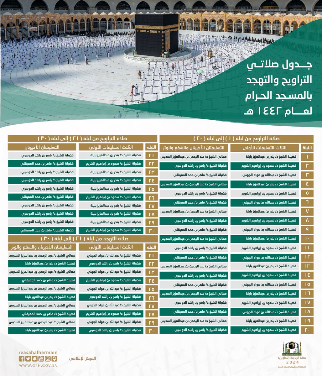 جدولي صلاتي التراويح والتهجد بالحرمين الشريفين خلال شهر رمضان المبارك 1442هـ.