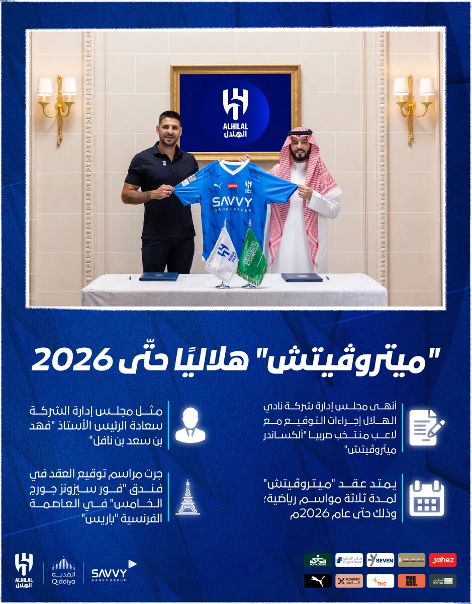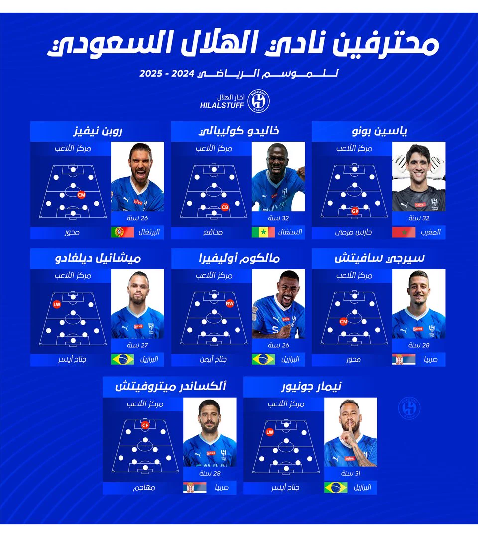 أعمار لاعبي الهلال الأجانب : • بـونـو : (32) عام • كوليبالي : (32) عام • نيمار : (31) عام • ميتروفيتش : (28) عام • سافيتش : (28) عام • ميشيل : (27) عام • مالكوم : (26) عام • نيفيز : (26) عام. |